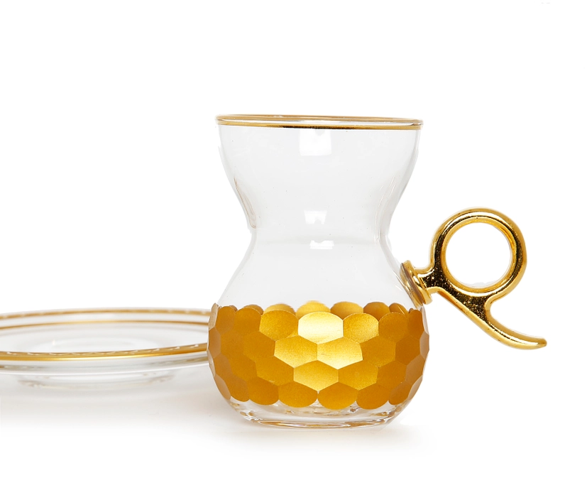 Adorn your table with these tea glasses with gold hammered base. These exquisite glasses will delight your guests with their stunning appearance. What an elegant way to uplift your dining experience! Measures: 2.5”D x 3.5”H